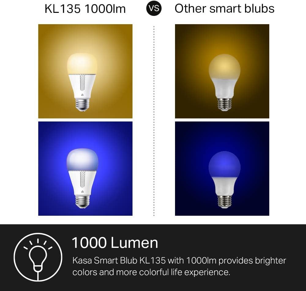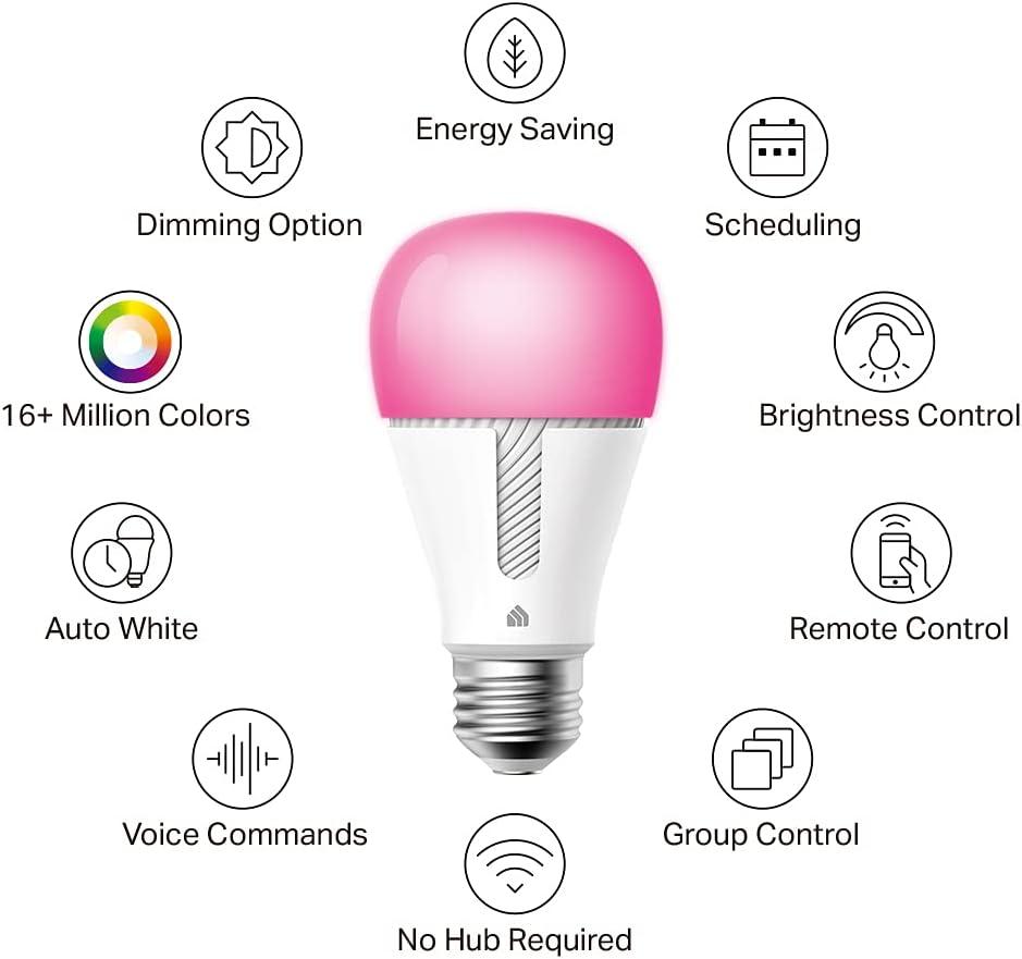 Dimmable 16 million colors and warm to cool whites(2500K-6500K), E26 A19 base. Explore endless lighting possibilities to create your favorite light effects for every scene you need. The Kasa app contains not only all the feature you expect from TP-Link Kasa family, but also guidance for you through each step of the installation to connect your smart bulb with your home Wi-Fi, Alexa or Google assistant.