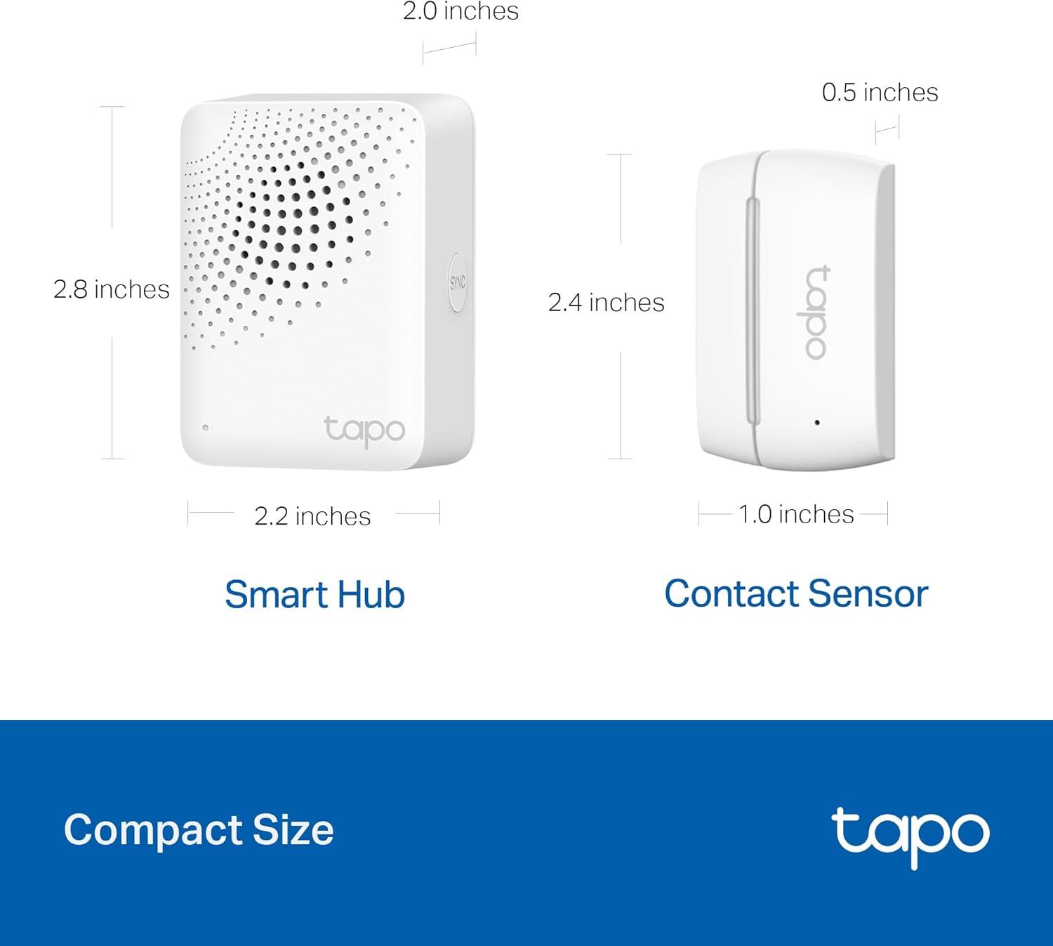 This purchase includes 3x Tapo T110 Contact Sensors and 1x Tapo H100 Smart Hub with Chime. Tapo enhances home security and convenience through its ecosystem of smart devices managed by the central Tapo Hub. Contact sensors placed on doors and windows allow users to remotely check their status via the Tapo app, eliminating uncertainty. The Hub utilizes an ultra-low power protocol, extending the battery life of connected sensors, switches, and buttons up to tenfold. For integrated security, opening a door or window can trigger paired Tapo pan/tilt cameras to track movement and sound an alarm on the Hub, while real-time app notifications and an activity log provide immediate awareness and review capabilities. Furthermore, these sensors can be paired with smart lighting for automated illumination in designated areas. Installation is effortless with magnetic and adhesive mounting options, and the sensors' compact size ensures discreet placement throughout the home. Each Tapo contact sensor is measured as 2.42 x 1.48 x 0.48 inches. The Tapo Smart Hub is measured as 2.8 x 2.5 x 2 inches.